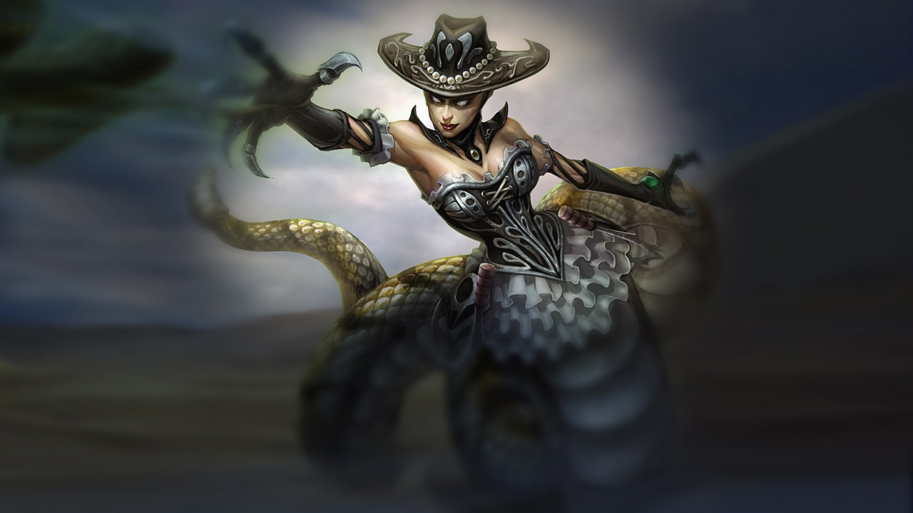 Cassiopeia is a deadly creature bent on manipulating others to her sinister will. Youngest and most beautiful daughter of the noble Du Couteau family of Noxus, she ventured deep into the crypts beneath Shurima in search of ancient power. There, she was bitten by a gruesome tomb guardian, whose venom transformed her into a viper-like predator. Cunning and agile, Cassiopeia now slithers under the veil of night, petrifying her enemies with her baleful gaze.